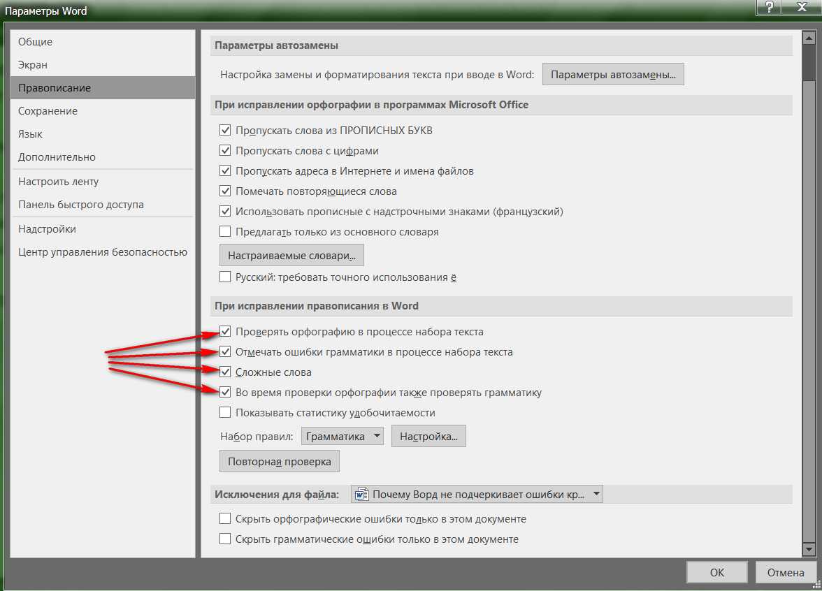 - В разделах «При исправлении правописания в Word» и «Исключения для файла» установите соответствующие настройки, в зависимости от того, в каких документах вам нужно отключить показ ошибок орфографии и грамматики.