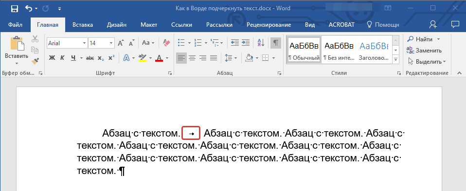 Выделите знаки табуляции, которые нужно подчеркнуть. Знак табуляции похож на маленькую стрелку.
