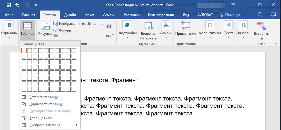 Чтобы вставить таблицу 1×1, выберите верхний левый прямоугольник.