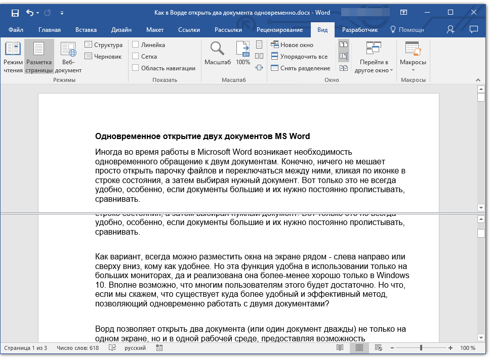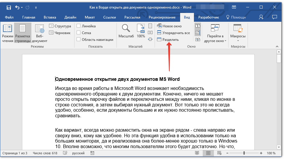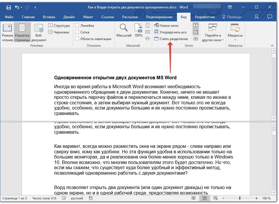 - Совет: Для отмены разделения документа во вкладке «Вид» и группе «Окно» нажмите кнопку «Снять разделение».