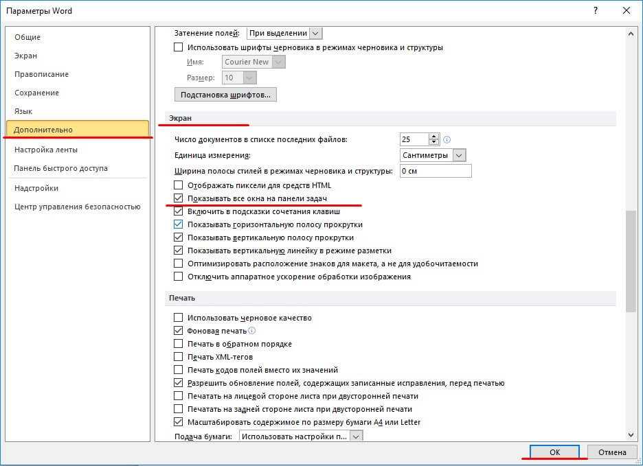 В параметрах переходим на вкладку Дополнительно и справа в окне ищем раздел Экран. Тут мы видим пункт Показывать все окна на панели задач ставим галочку напротив него сохраняем настройки и проверяем.