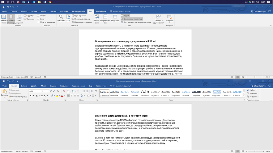 Включить отображение документа в двух окнах просто: сначала просто откройте нужные документы и далее на Ленте вкладка — Вид — Рядом.