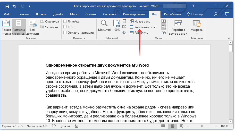 Если удобнее работать с файлами, когда они разделяются горизонтально, то в этом поможет команда «Упорядочить все». Однако ее возможности распространяются на все открытые окна Microsoft Word, а не только те, которые необходимы для одновременного просмотра.