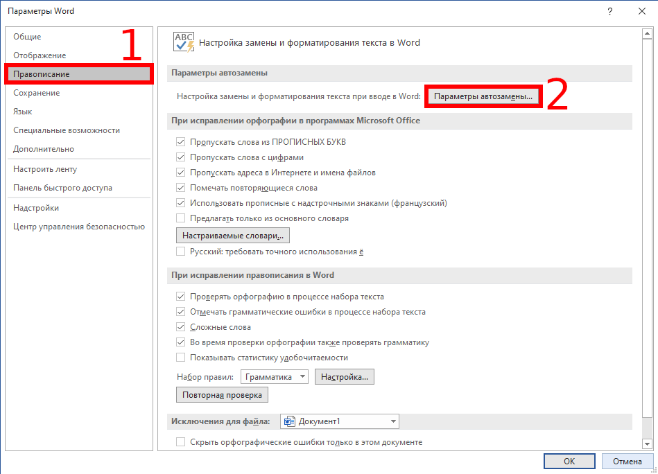В разделе «Параметры автозамены» нажмите кнопку «Параметры автозамены».