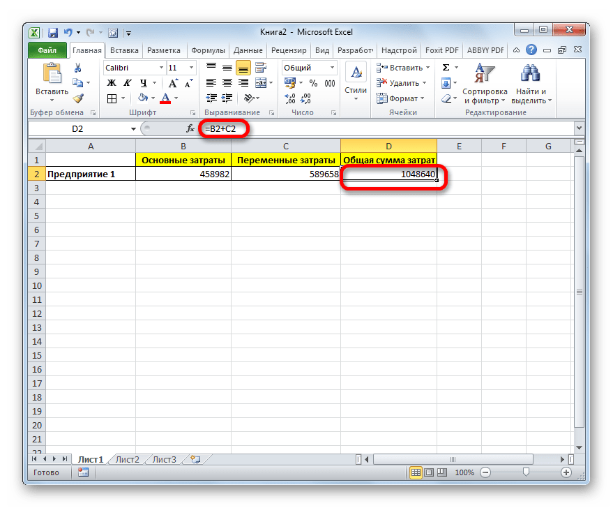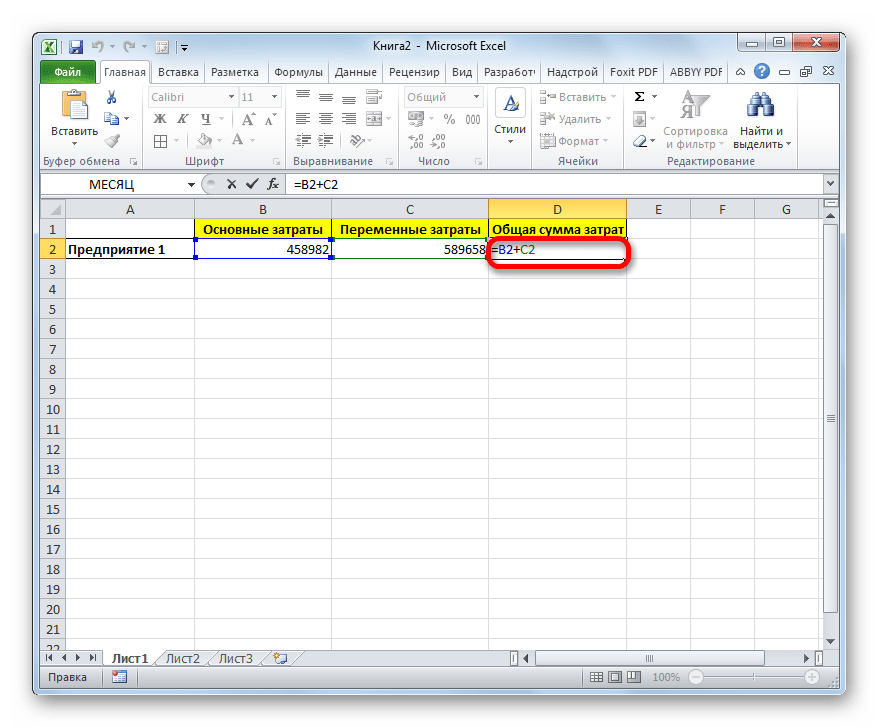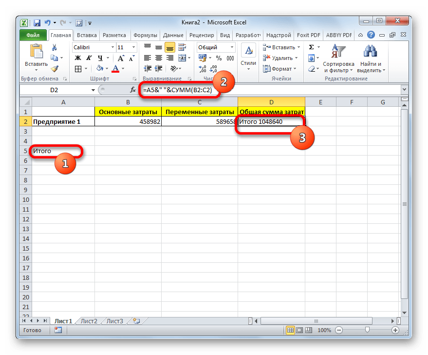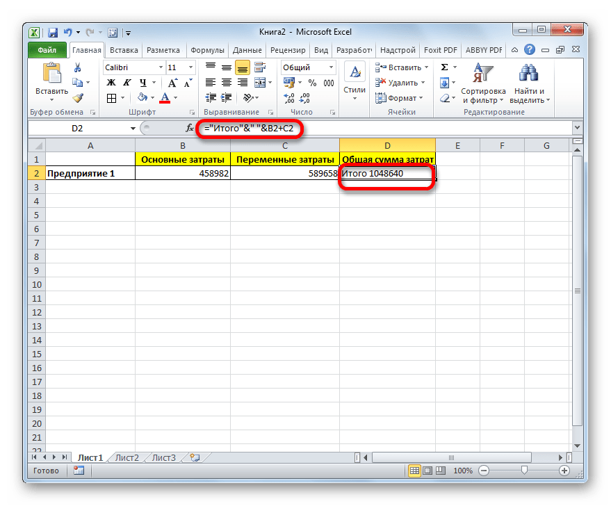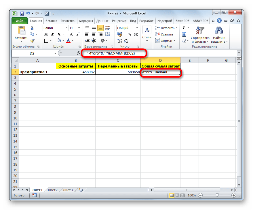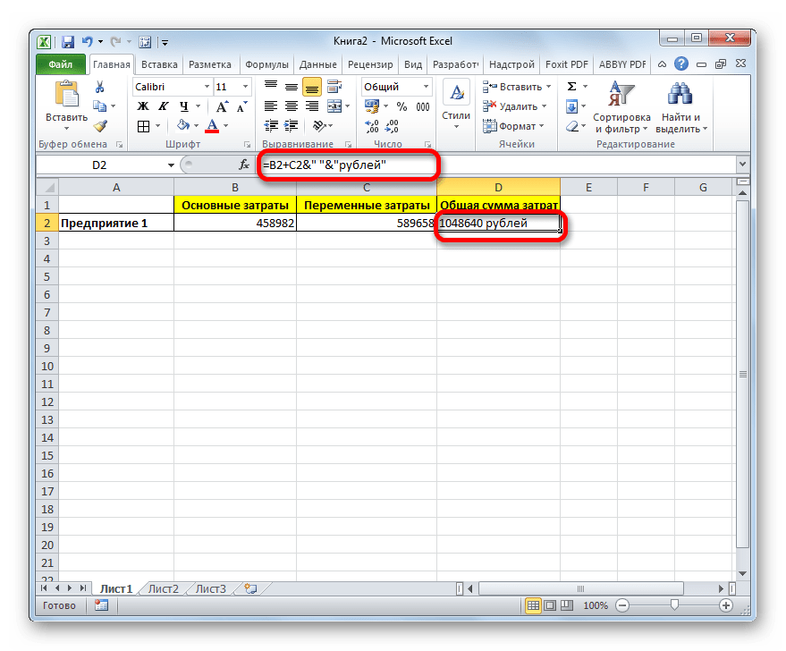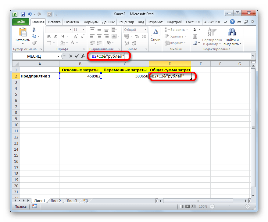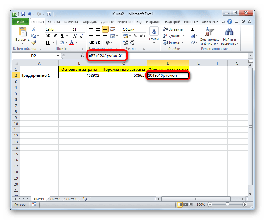 У нас имеется небольшая таблица, в которой в двух столбцах указаны постоянные и переменные затраты предприятия. В третьем столбце находится простая формула сложения, которая суммирует их и выводит общим итогом. Нам требуется в ту же ячейку, где отображается общая сумма затрат добавить после формулы поясняющее слово «рублей».