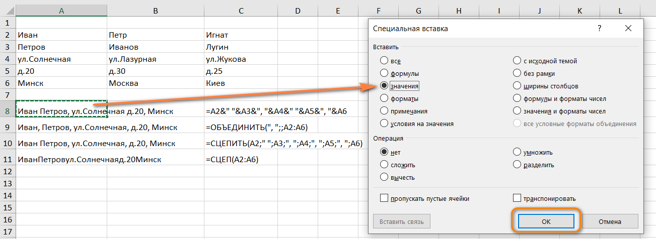 Если вы объединяли построчно значения в нескольких столбцах, то, естественно, можно выделить сразу несколько позиций и использовать этот инструмент специальной вставки, чтобы заменить формулы на их значения.