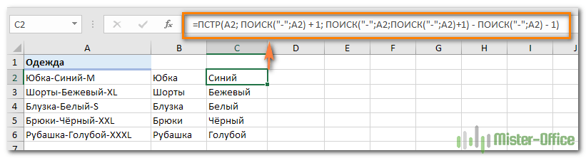 - Чтобы извлечь цвет (то есть все буквы между первым и вторым дефисом), напишите в C2, а затем скопируйте ниже: