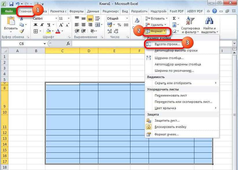 - На главной вкладке из выпадающего списка «Формат» выберите опцию «Высота строки» и укажите желаемое значение.