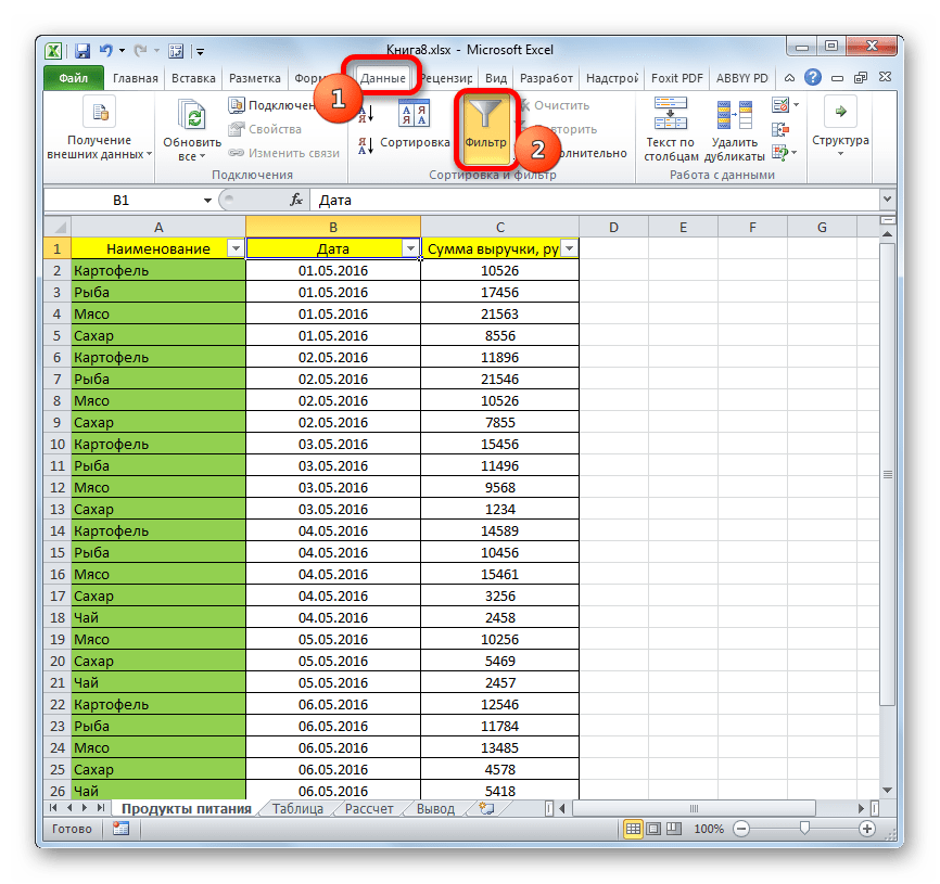 Если фильтр в таблице больше не нужен, переходим на вкладку “Данные”, где нажимаем кнопку “Фильтр” в разделе инструментов “Сортировка и фильтр”.