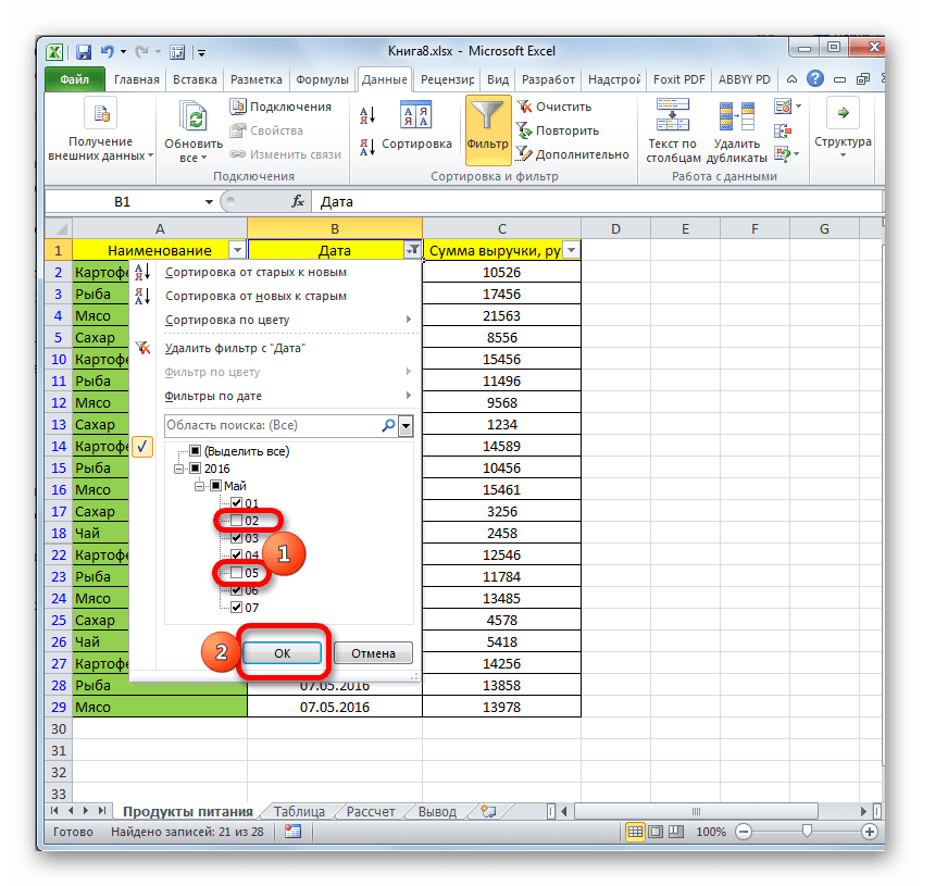 После этого скрытые раннее данные появятся в Excel. Если же вы вообще решили убрать фильтрацию, нужно нажать на «Фильтр», который находится в разделе «Данные» на ленте и в группе «Сортировка и фильтр».
