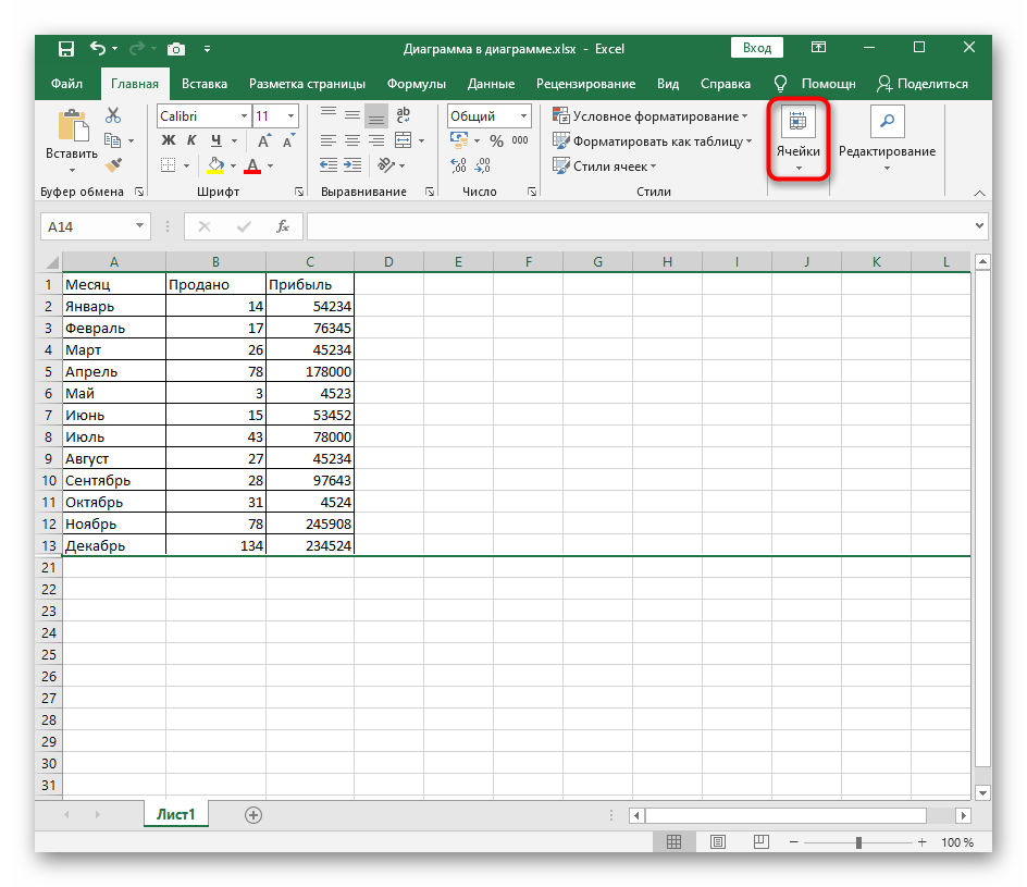 - Находясь на вкладке «Главная», откройте блок «Ячейки».