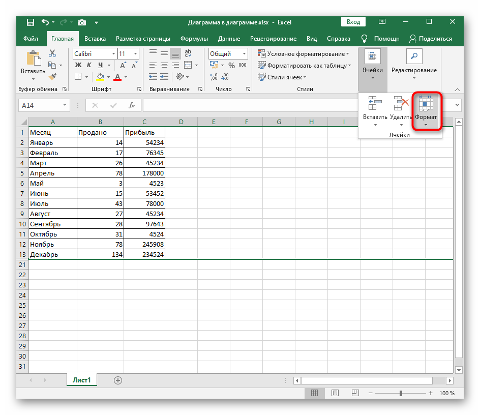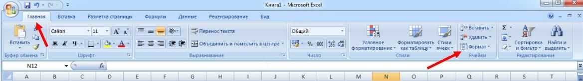 - Перейдите на вкладку «ГЛАВНАЯ» –> группа «Ячейки» и нажмите кнопку «Формат».