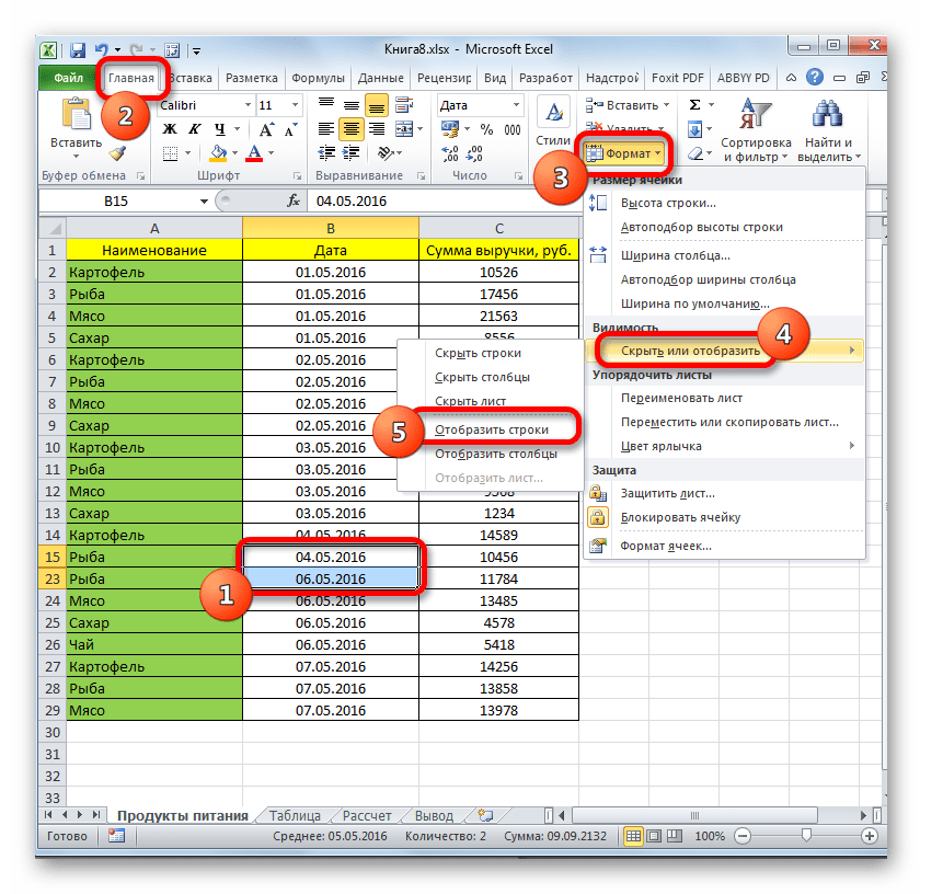 Как скрыть строки в Excel – Скрыть строки, используя ленту