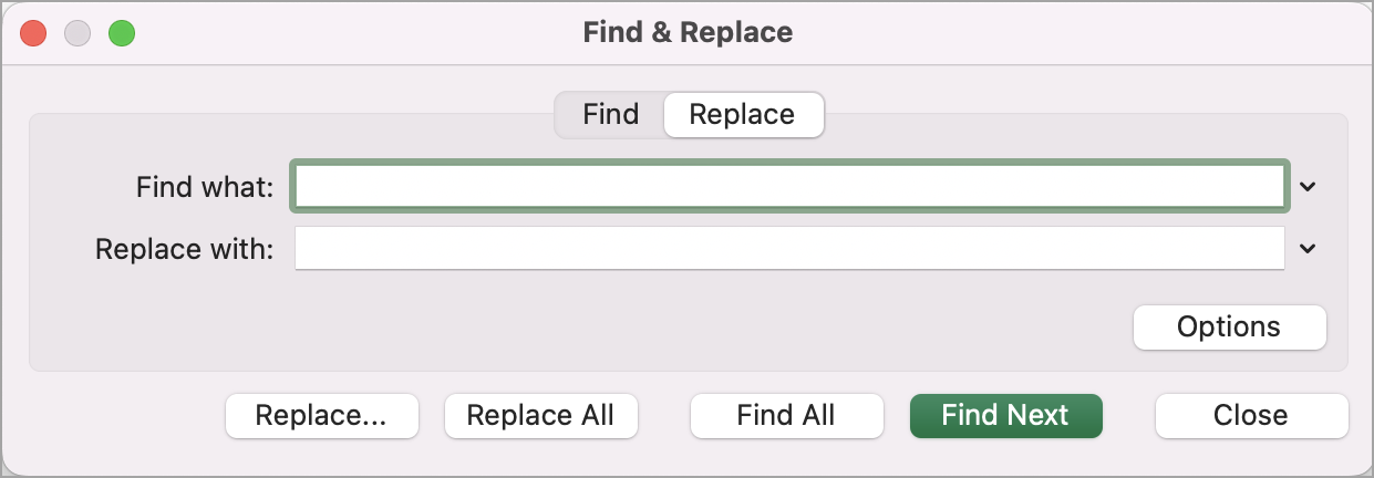 Совет: При нажатии кнопки Заменить все все вхождения условий, которые вы ищете, будут заменены, в то время как Replace будет обновлять одно вхождение за раз.