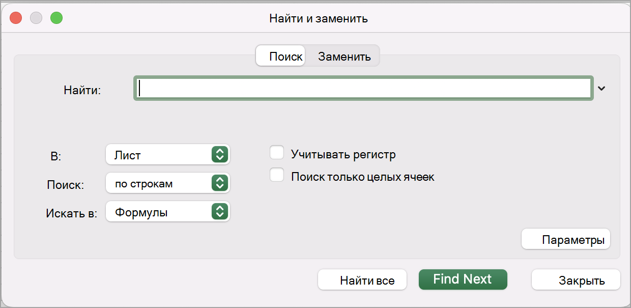 Примечание: Формулы, значения, заметки и примечания доступны только на вкладке Найти . На вкладке Заменить доступны только формулы.